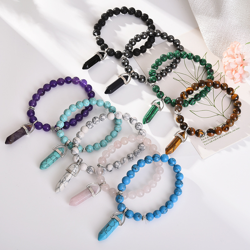 Elevate your style with our stunning Round Bead Amethyst Powder Crystal Fashion Bracelet. This exquisite piece is designed with a variety of geometric beads that not only catch the eye but also showcase the beauty of natural stones. Each bracelet features a unique combination of colors including black, volcanic stone, purple, turquoise, tiger eye stone, and pink crystal, allowing you to express your individuality with every wear.